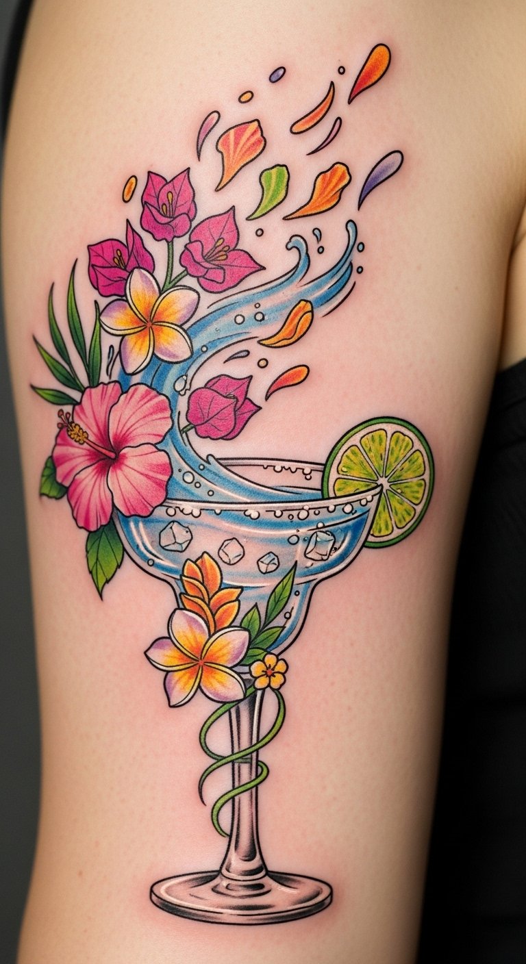 Tropical margarita tattoos symbolize relaxation, celebration, and a love for sunlit memories; they can evoke nostalgia for travel or a daily reminder to savor small joys.