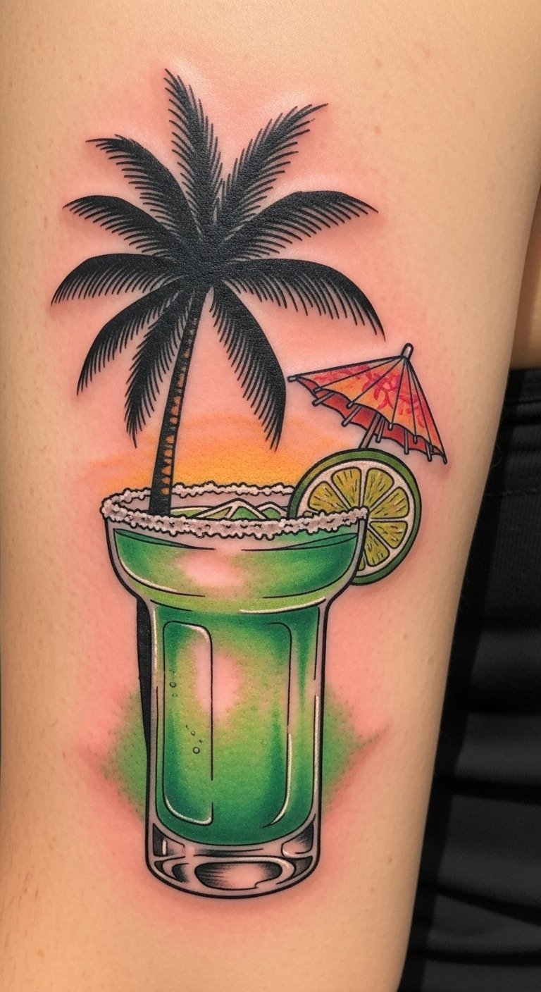 Emotionally playful and warm, this design works well on forearms, ankles, or behind the shoulder where the palm silhouette and bright green cocktail can curve with the body to suggest movement and breeze, creating a personal talisman of carefree, ocean-side moments.