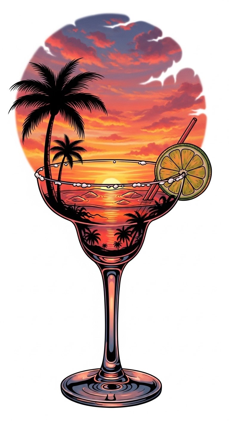 This design concept merges drink and horizon: a stylized margarita glass with layered liquid reflecting a miniature sunset—warm oranges, pinks, and soft purples—palms silhouetted against the rim and tiny waves lapping at the glass base.