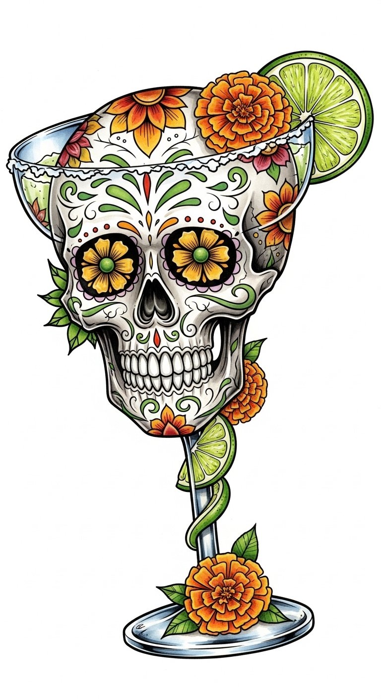 This design symbolizes joyful acceptance and celebration—melding Day of the Dead iconography with the carefree spirit of a margarita to express love, festivity, and freedom.
