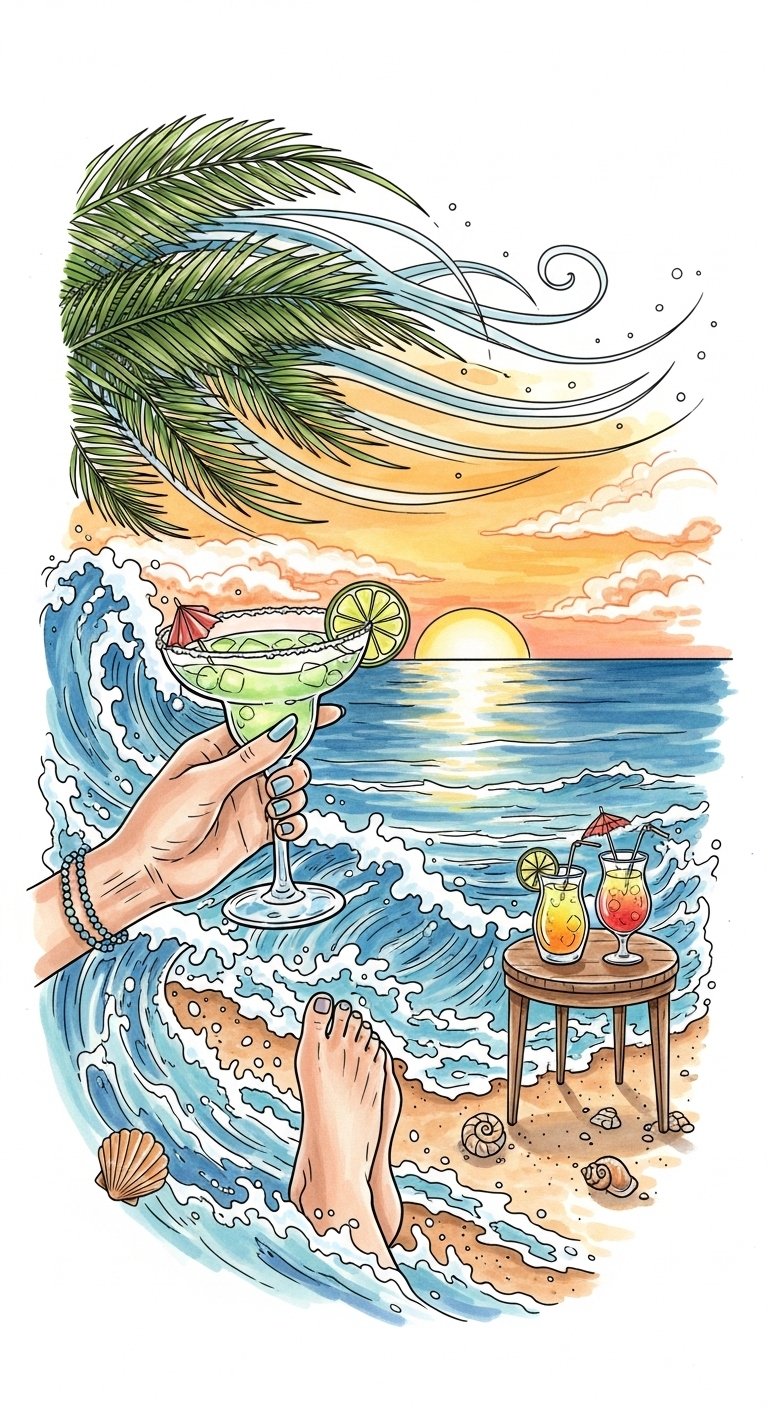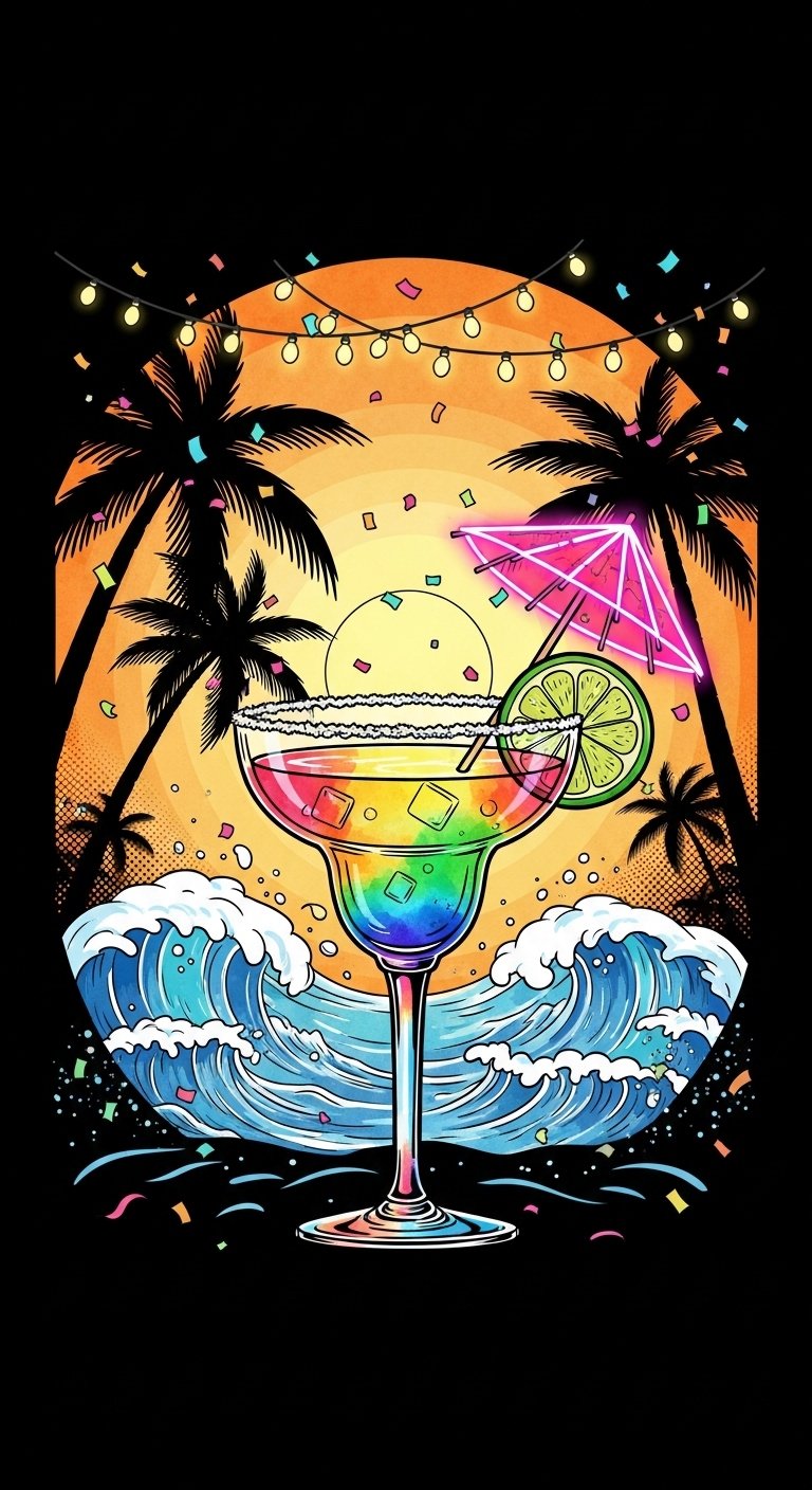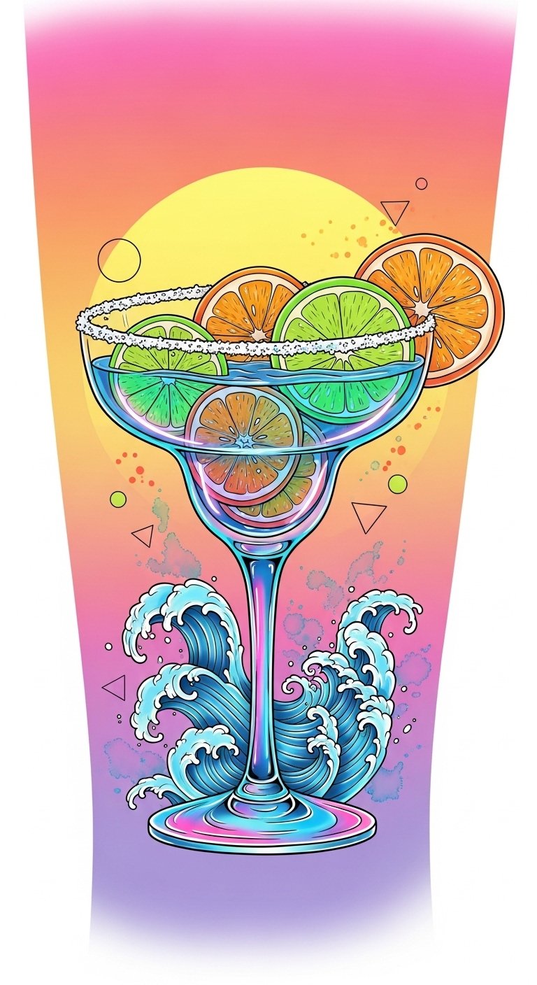 This design translates the scene’s sensory richness into symbolic elements: the margarita represents celebration and refreshment, waves signal emotional flow and calm, and dancing cocktails and vibrant splashes evoke joy and festive energy.