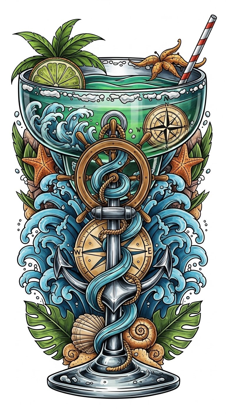 This design fuses classic maritime symbols—anchor for stability, ship wheel for guidance, compass rose for direction—interwoven with a margarita glass and surf-swept waves to evoke relaxation, celebration, and wanderlust;