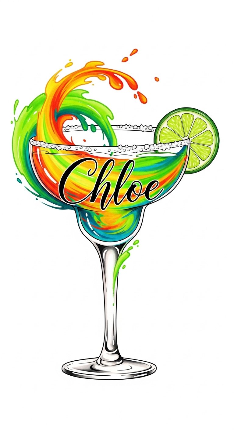 This design blends playful vibrancy and intimate personalization: the margarita glass rendered in luminous greens and citrus yellows with watercolor splashes and subtle salt-stipple texture surrounding a scripted name that follows the curve of the glass.