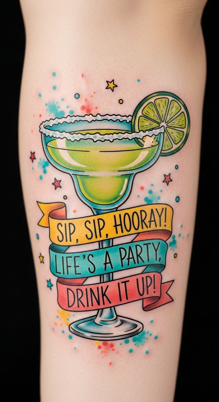 A margarita tattoo featuring a fun quote can perfectly blend your love for the cocktail with a touch of humor or inspiration.