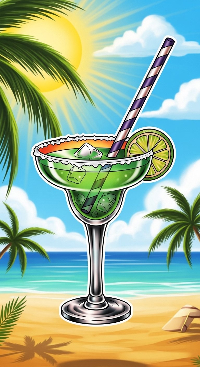 This design symbolizes carefree summer energy and sociable warmth—bold colors and a classic straw evoke nostalgia and celebration, while the margarita glass suggests relaxation and shared moments.
