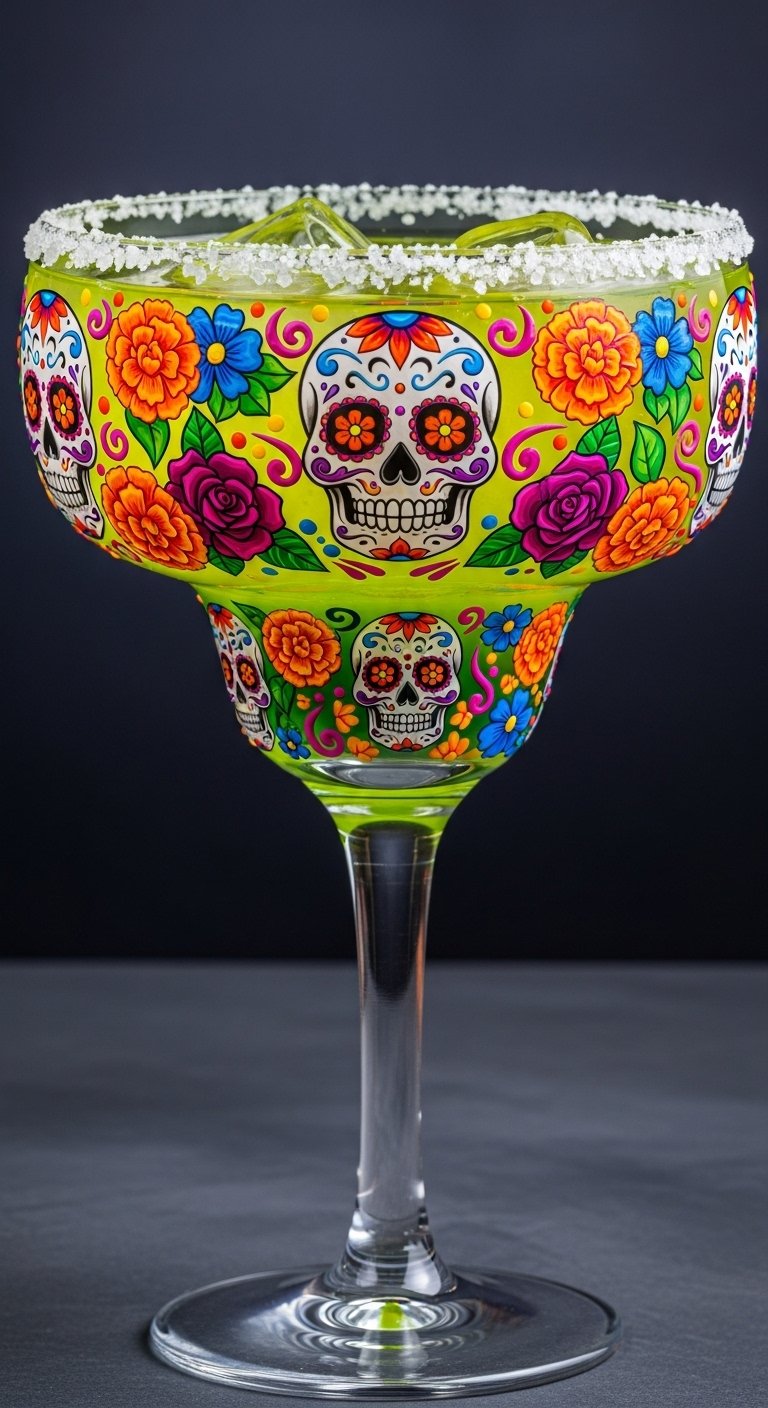 This design blends celebratory energy and reverence: the margarita glass becomes a vessel of memory decorated with sugar skull motifs symbolizing ancestral connection, marigolds and roses for remembrance and the cycle of life, and swirling filigree conveying movement and joy.