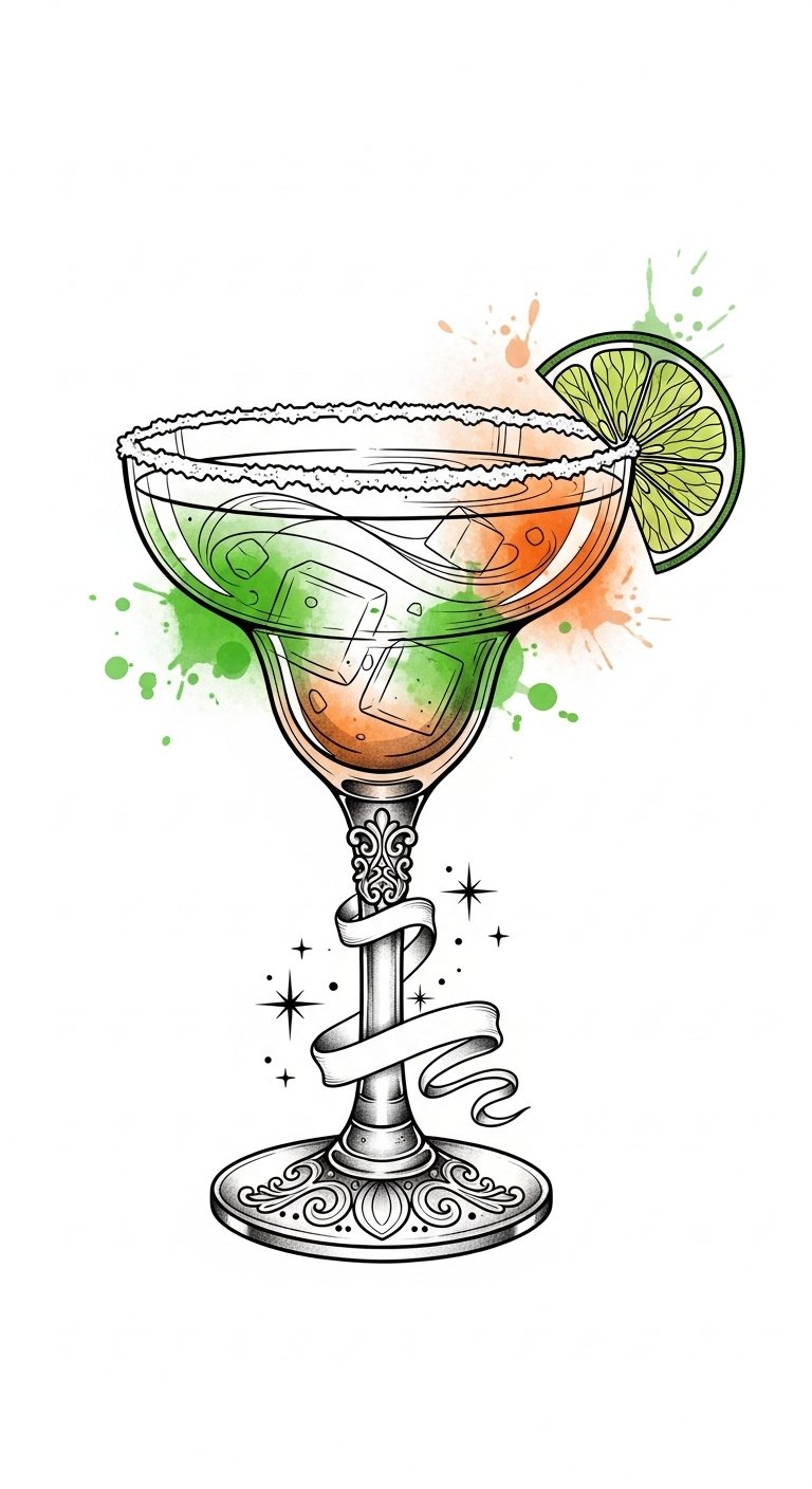 Picture the zesty lime wedge perched on the rim, bursting with freshness, while hints of lime zest dance in the air, inviting you to savor every moment. The design evokes joy, festivity, and a carefree summer night; placed on the forearm it reads as a cheerful statement piece, on the shoulder it becomes a subtle ode to good times, and scaled smaller it can tuck neatly behind the ear or at the wrist for a playful, personal talisman.