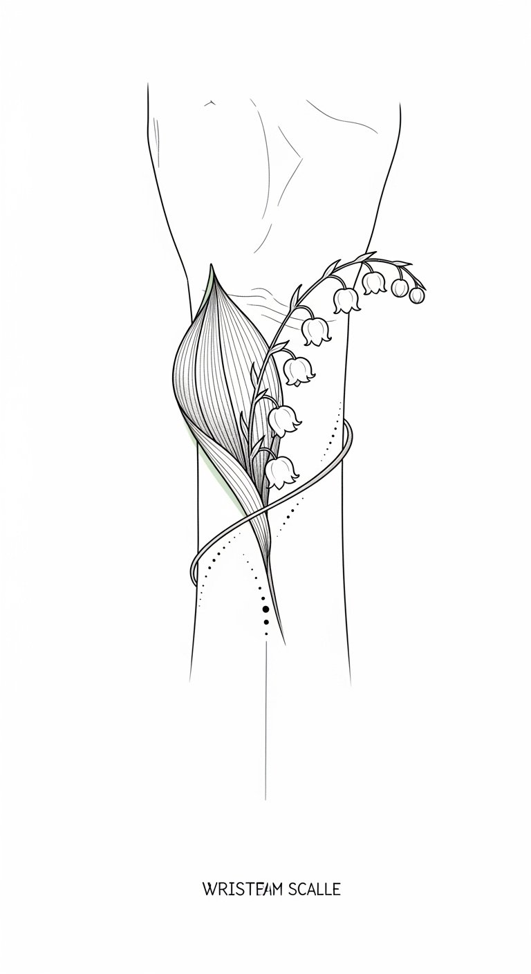 The delicate charm of the Lily of the Valley makes it a stunning choice for a wrist tattoo. Its elegant wrist placement captures the essence of lily symbolism, representing purity and renewal.
