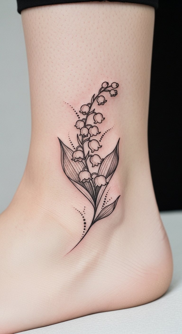 A refined ankle tattoo featuring a petite Lily of the Valley cluster evokes humility, sweetness, and quiet strength; placed to follow the natural curve of the ankle, it reads as intimate and personal, suggesting freedom and femininity without overpowering.