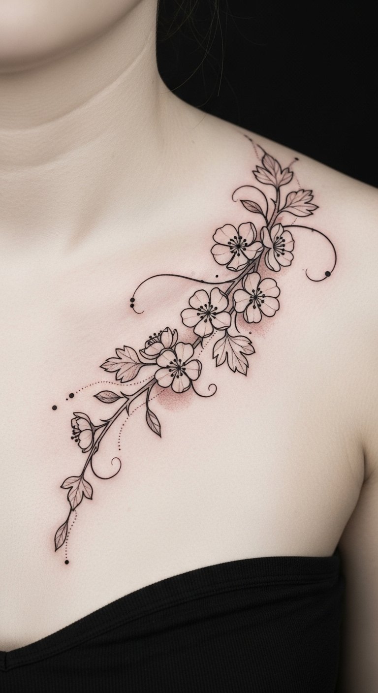 Embracing the elegance of the hawthorn flower, a flowing collarbone tattoo can transform your skin into a canvas of nature’s beauty.