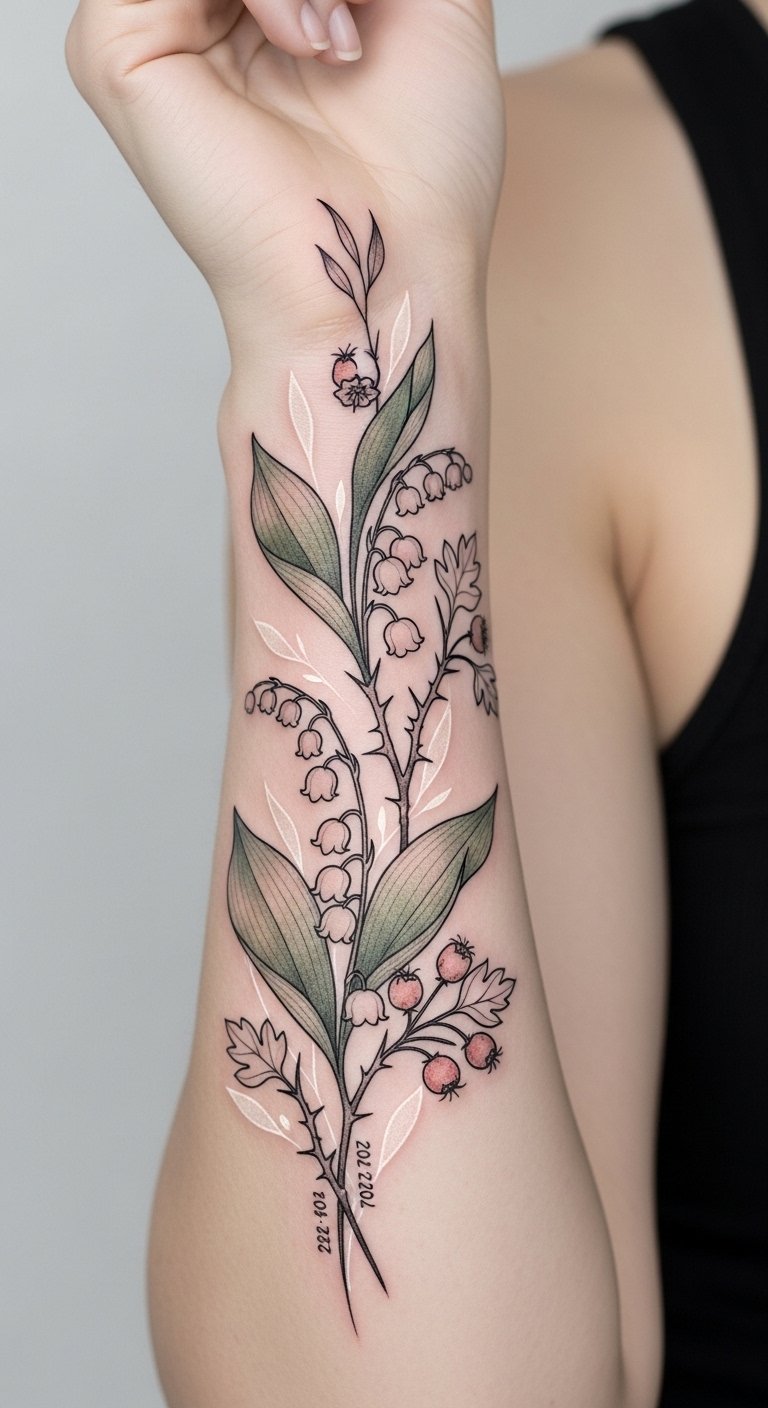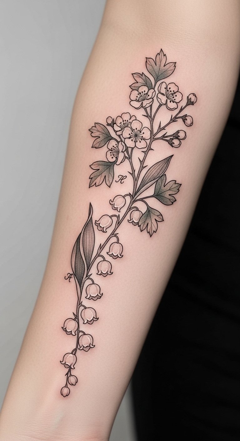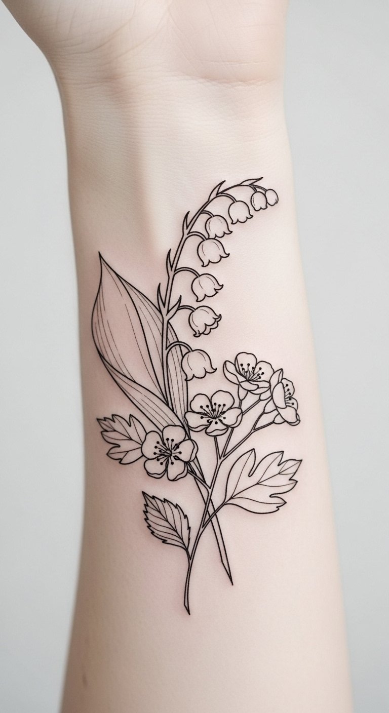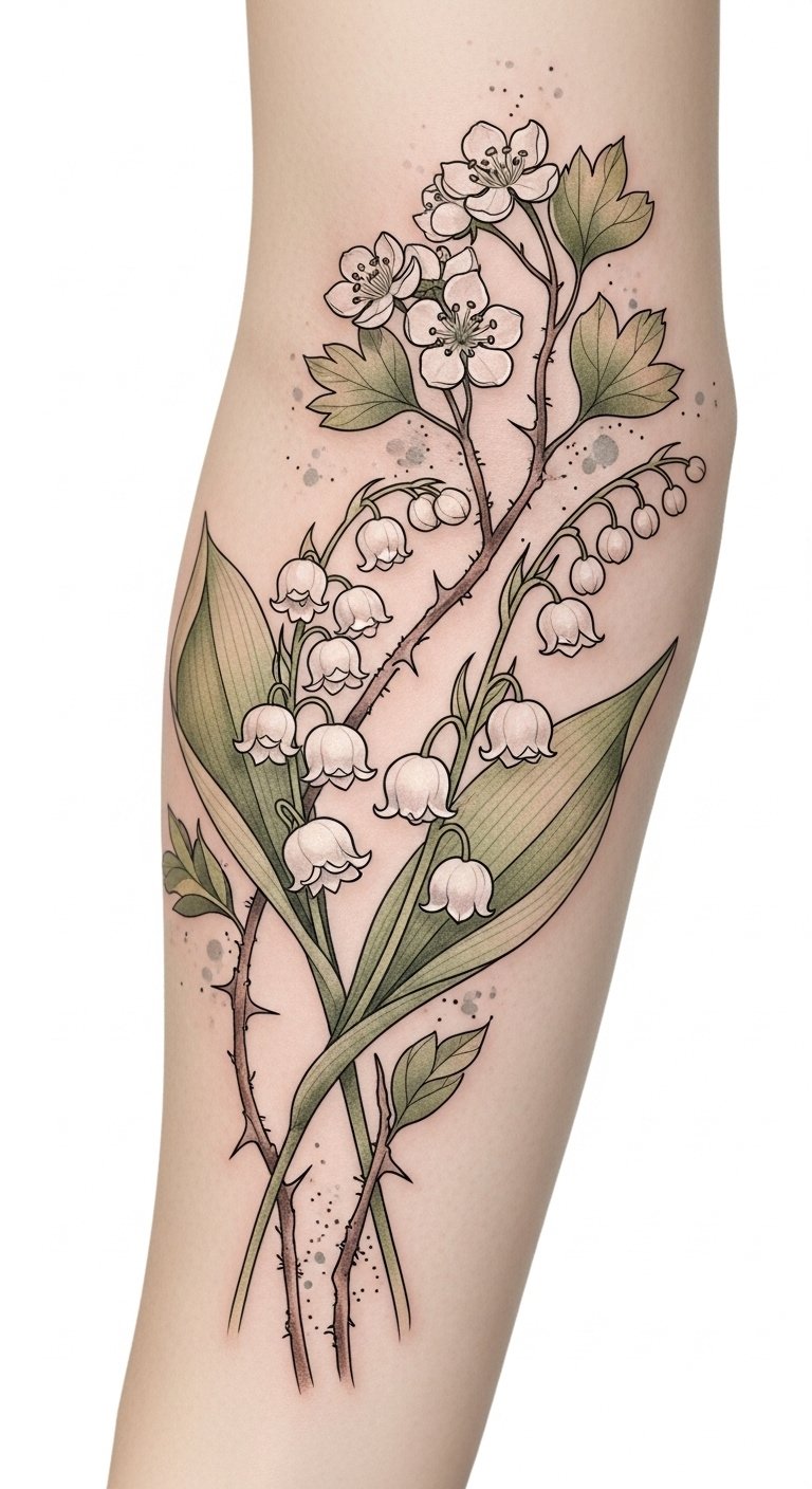 The symbolism of lily of the valley conveys sweetness, humility, and a return to happiness while hawthorn brings protection and enduring love; together they evoke a layered emotional narrative ideal for intimate placements like the inner wrist, collarbone, or behind the ear where the design can feel both personal and visible.