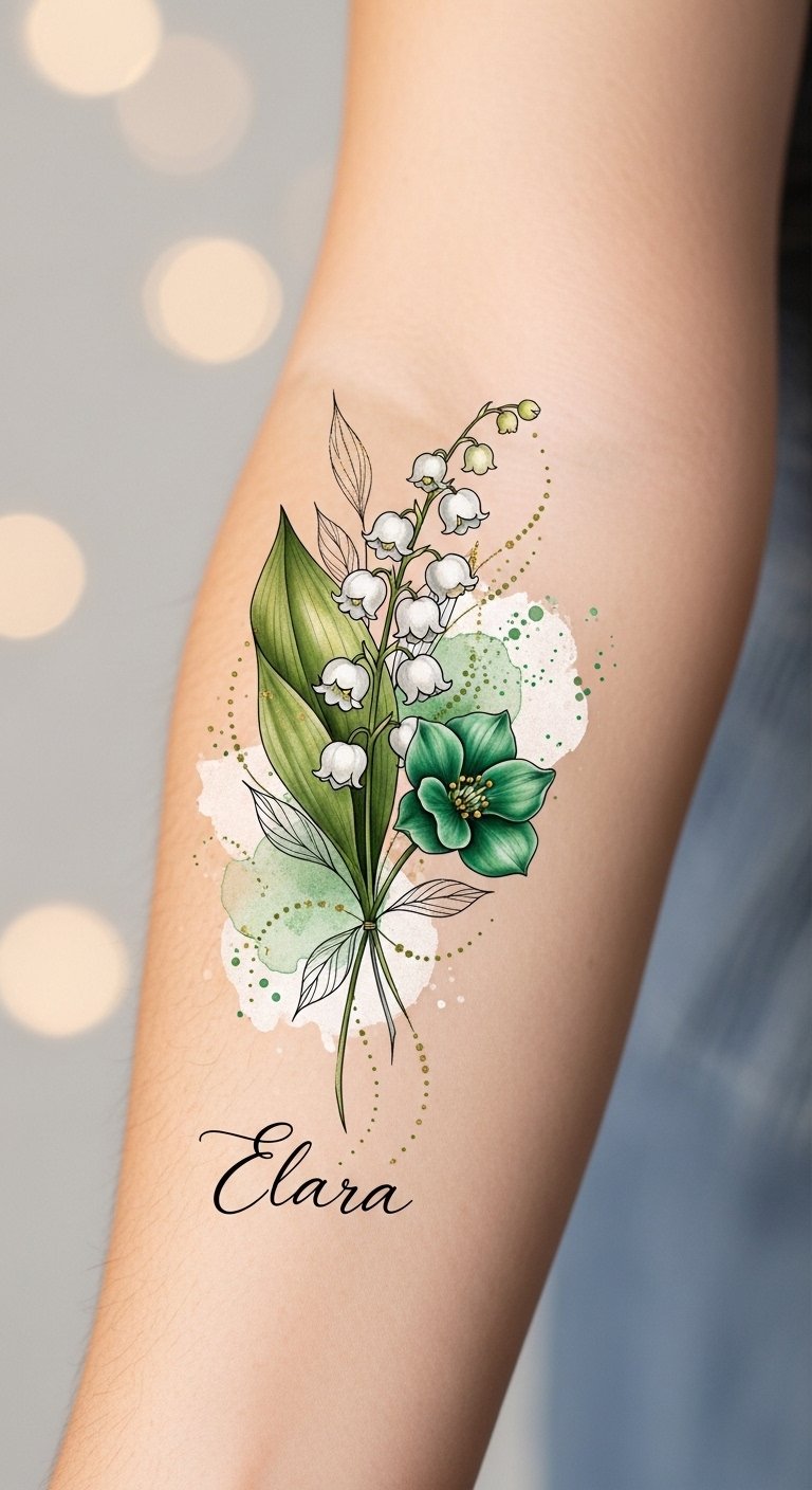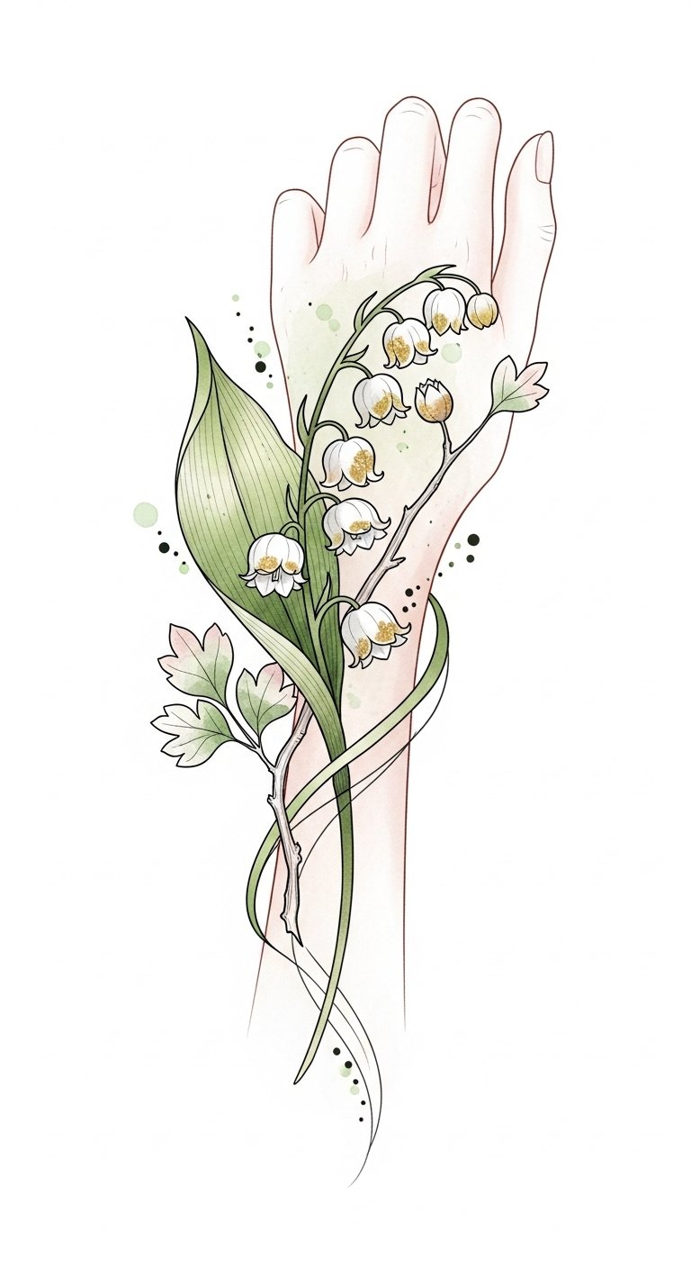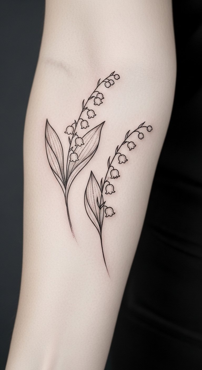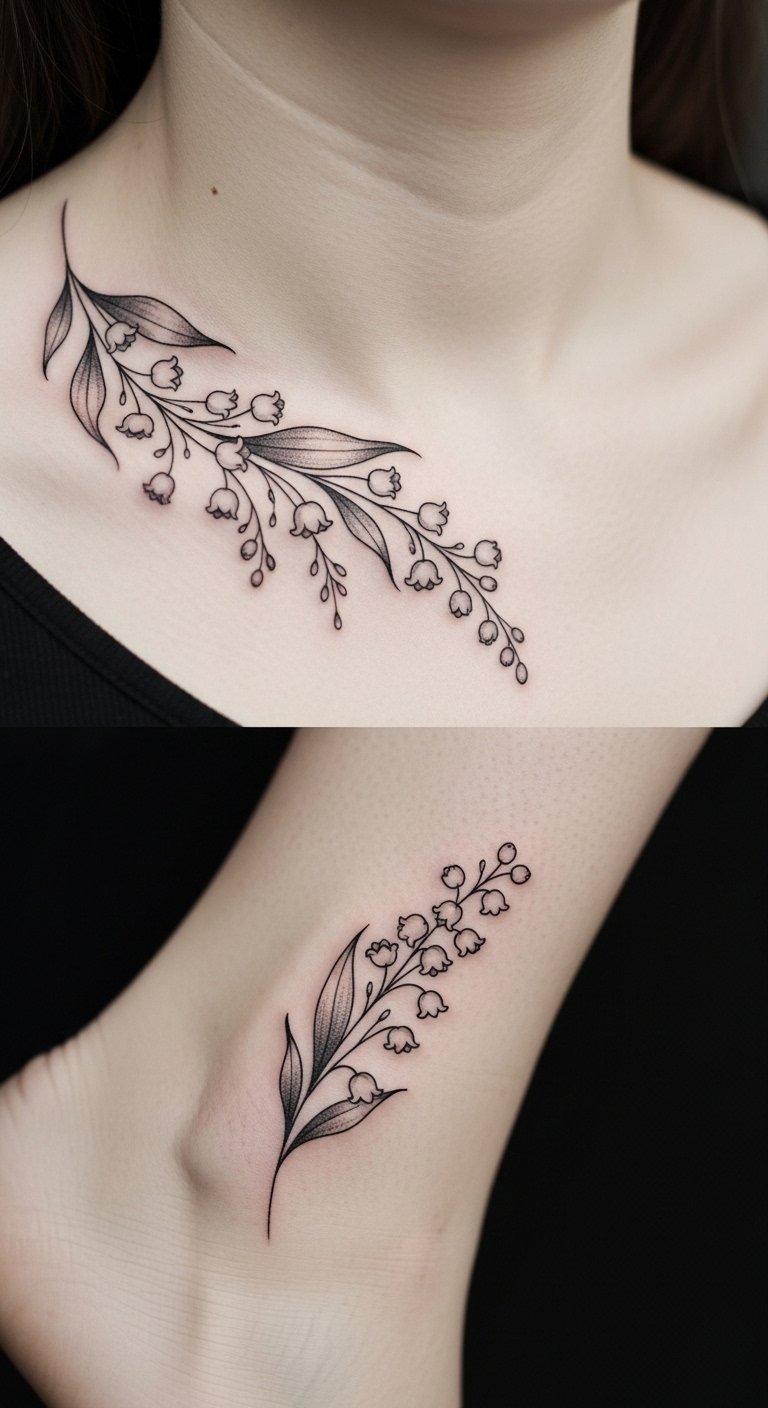 The symbolism of lily of the valley conveys sweetness, humility, and a return to happiness while hawthorn brings protection and enduring love; together they evoke a layered emotional narrative ideal for intimate placements like the inner wrist, collarbone, or behind the ear where the design can feel both personal and visible.