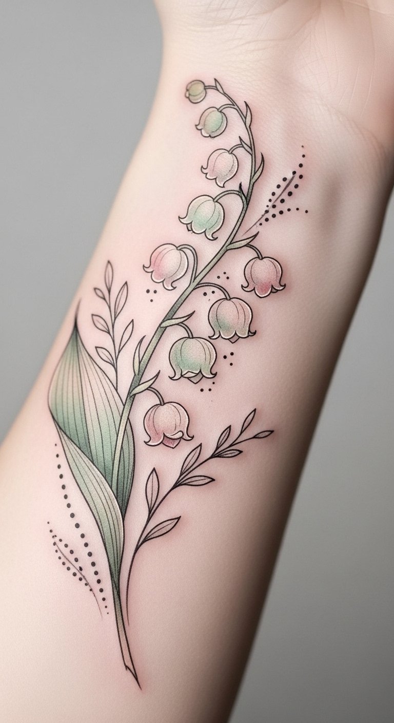 The delicate charm of a soft pastel lily of the valley tattoo whispers elegance and grace.