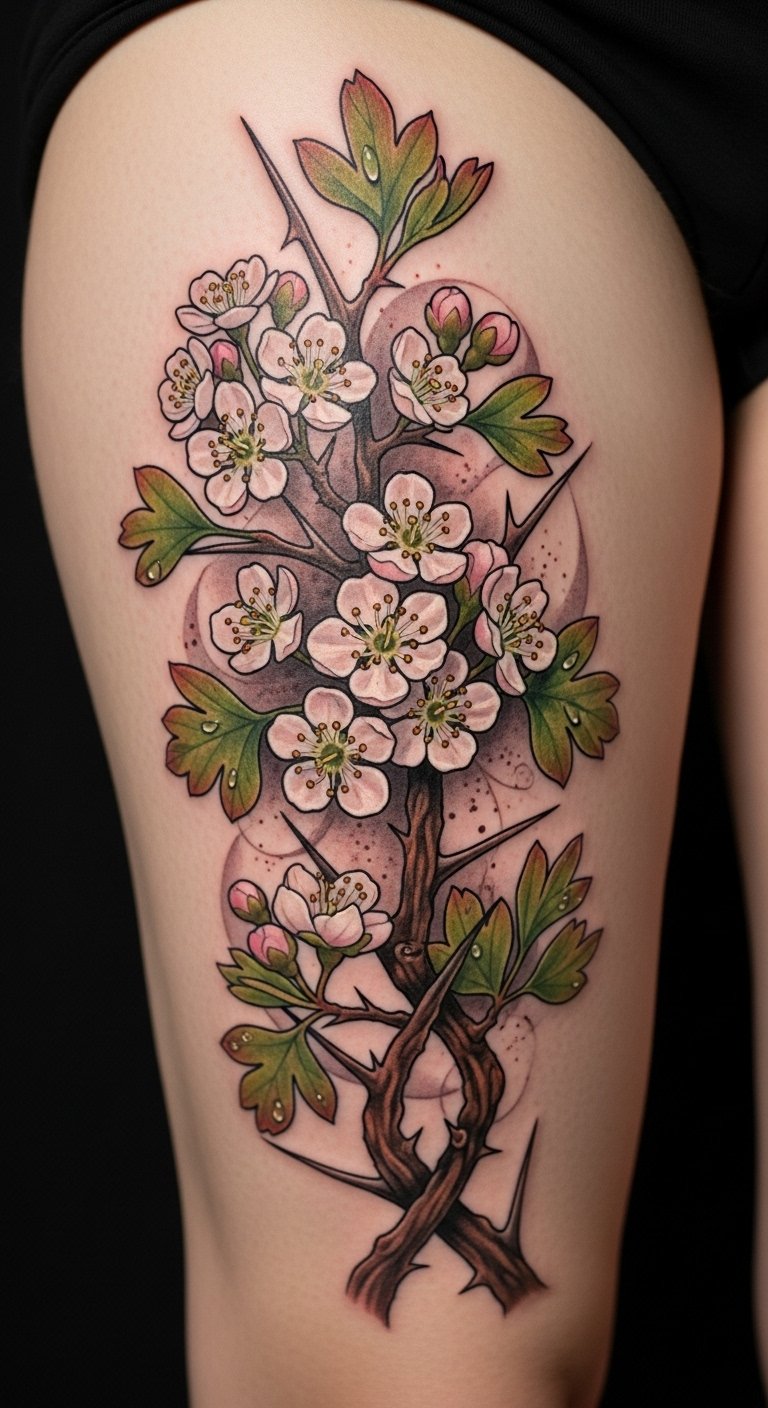 This enchanting design embodies hawthorn symbolism—protection, love, and rebirth—while the thigh tattoo placement offers a bold canvas for expression.