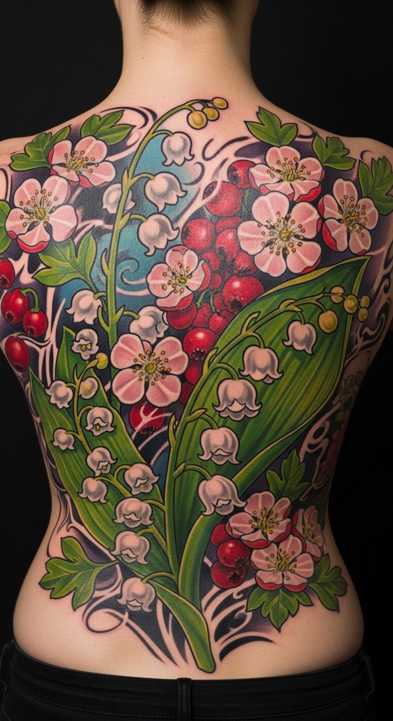 This design pairs hawthorn and lily of the valley across the spine and shoulder blades, symbolizing protection, healing, humility, and new beginnings; bold color contrasts and fine petal detail evoke resilience and tender vulnerability.