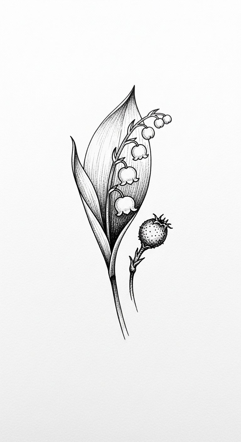 This design concept uses the original passage as the visual and emotional blueprint: a lifelike spray of lily of the valley rendered with fine line work, soft grayscale shading, and selective white highlights to emphasize bell-shaped blossoms and slender arching stems.