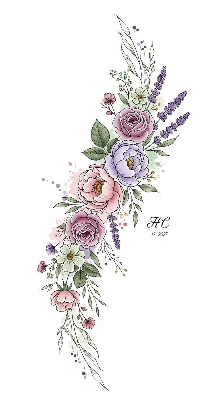 Each element of this design holds meaning: roses for love and resilience, peonies for honor and healing, lavender for calm and remembrance, and wildflowers for freedom and individuality.