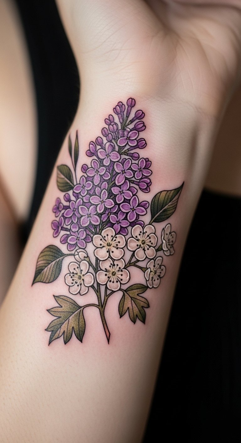 These intertwined lilac and hawthorn designs symbolize a balance of tender love and resilient hope, evoking gentle warmth and quiet strength; place a small, cascading cluster along the inner wrist for intimate meaning, a curved shoulder piece to suggest openness and movement, or a bold forearm band to declare individuality—inked in soft purples and muted greens with fine-line detailing to convey delicacy, or in richer tones and bolder strokes to project confidence and freedom.