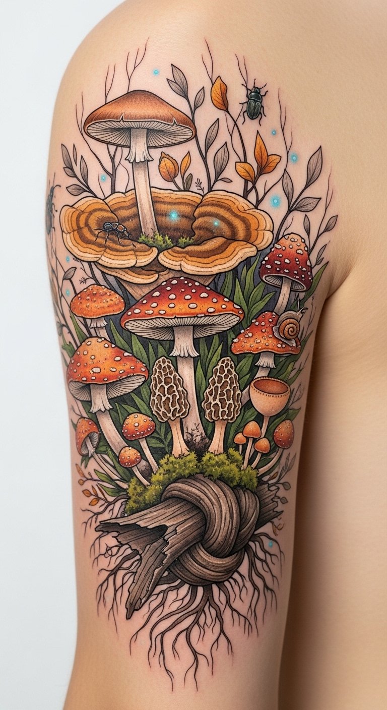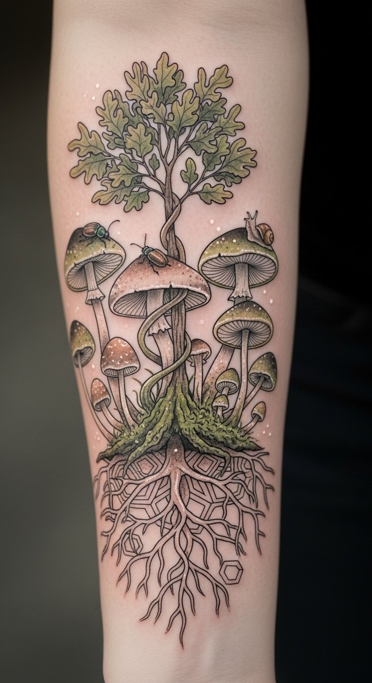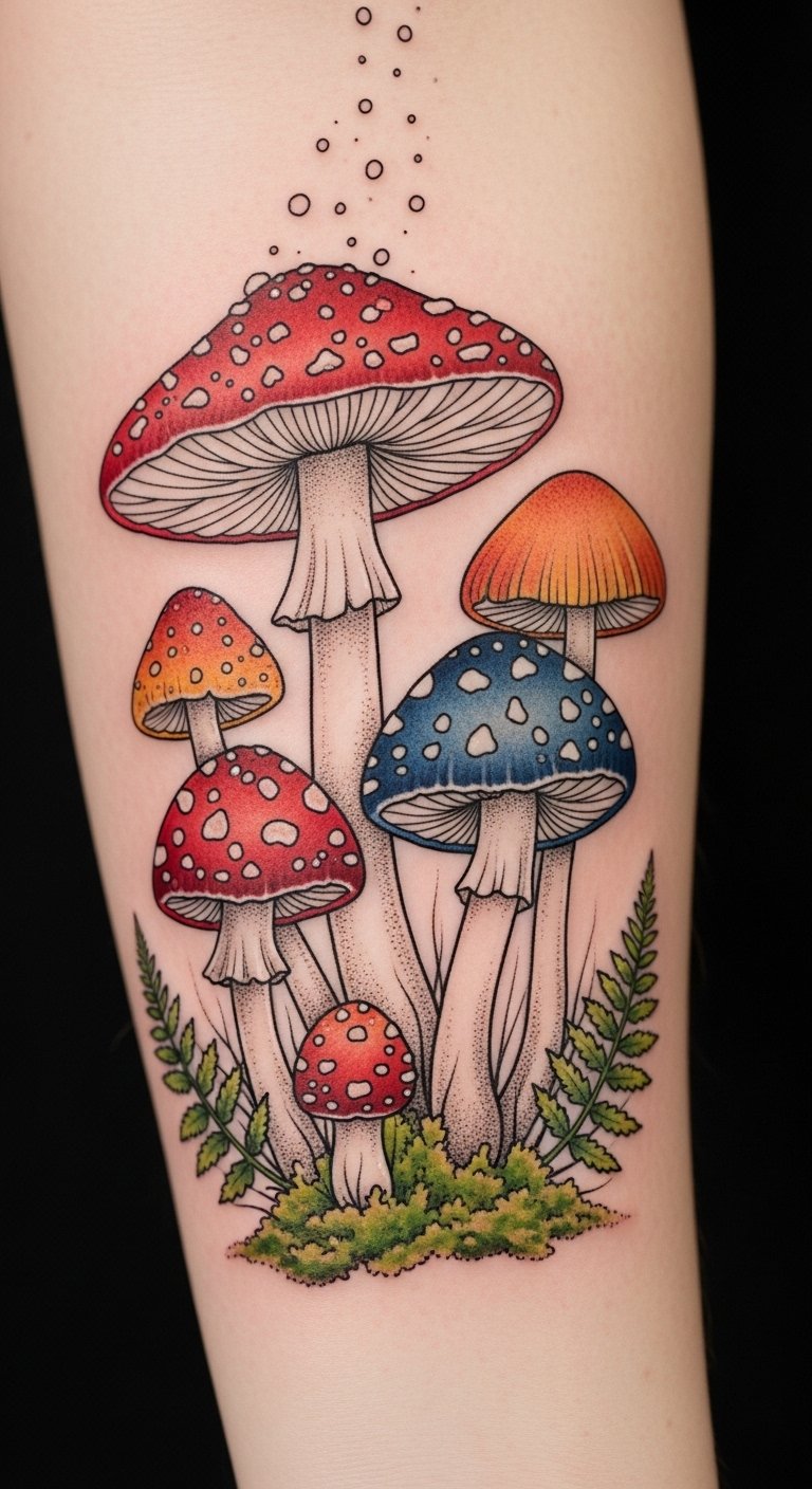 Mushroom tattoos embody transformation and rebirth, reflecting the incredible life cycles of fungi that thrive in decay and darkness.