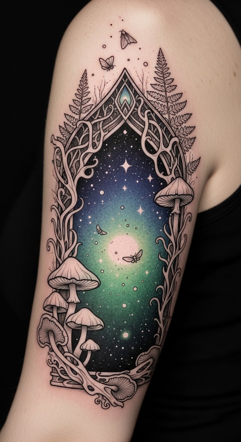 This piece symbolizes transition and curiosity—the arch as a threshold, the mushrooms and mycelium as hidden networks of wisdom, and the starry portal as the inner landscape of imagination; it conveys quiet reverence and beckoning wonder, working well centered on the upper back or along the forearm where its verticality emphasizes passage and intimacy.