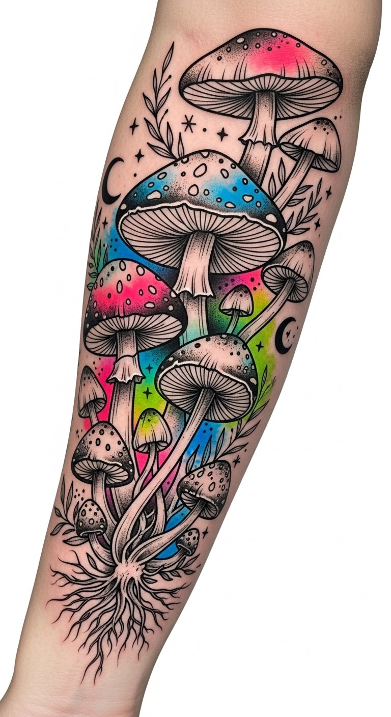 How can you guarantee your vibrant mushroom tattoo remains a stunning piece of art for years to come? Choose colors with rich saturation; they’ll resist ink fading better than lighter hues. Lively greens, deep reds, and electric blues can create a masterpiece that dances on your skin. Embrace the artistry, and let those colors breathe life into your tattoo, celebrating your unique connection to nature. This design concept uses saturated colors and bold outlines to convey resilience and vitality; symbolize growth, renewal, and a deep bond to the earth with layered mushroom caps, intertwining foliage, and subtle light reflections. Emotionally the piece evokes joy and wonder, intended for a forearm or calf where movement enhances the “dancing” effect and visibility supports color longevity through regular care and touch-ups.