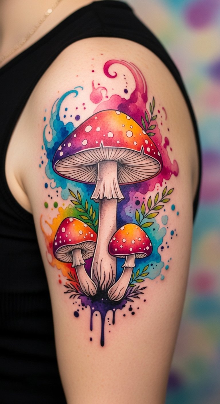 Colors burst to life in vibrant watercolor mushroom tattoos, transforming the humble fungi into a canvas of artistic expression. You’ll find vivid hues swirling together, evoking a sense of whimsy and freedom.