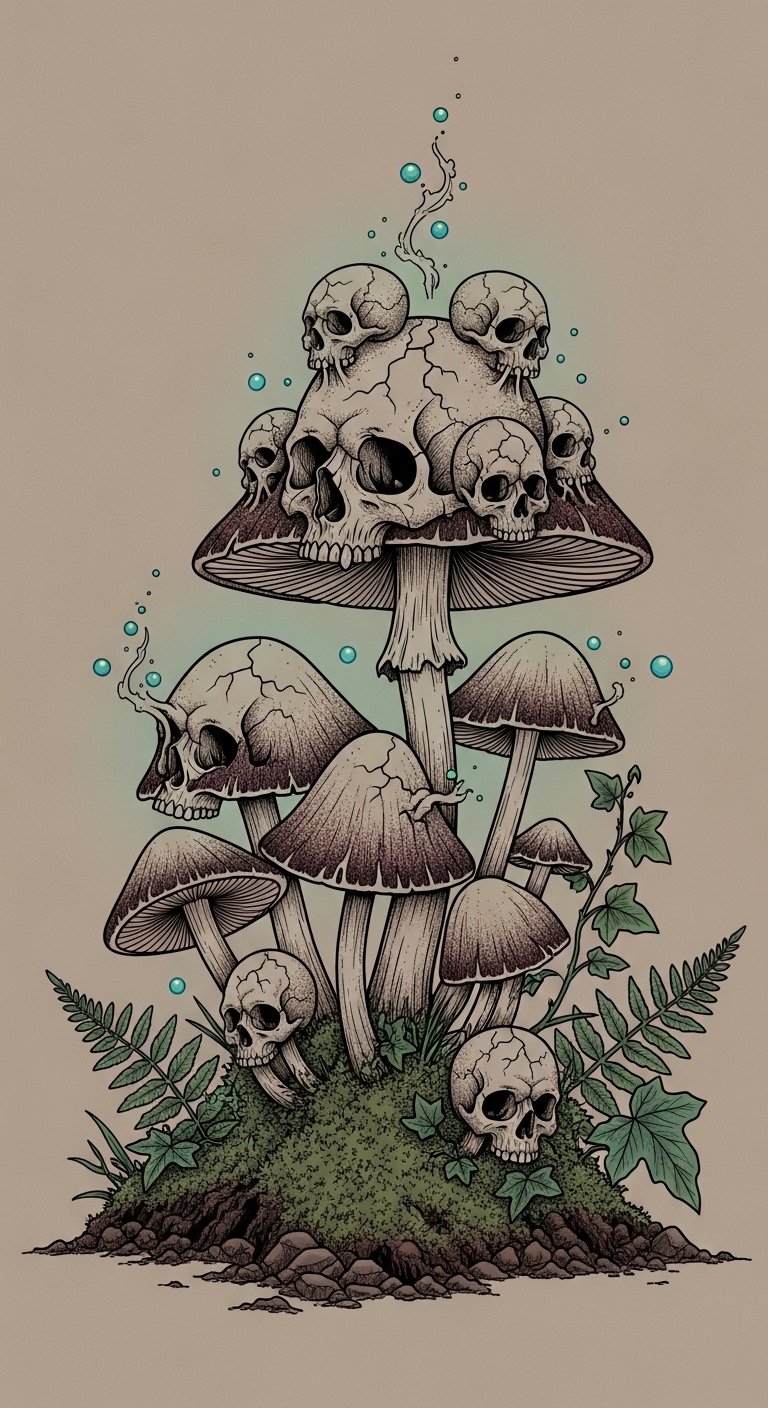 As you explore the enchanting world of skull-topped mushrooms, you’ll discover a striking blend of decay and renewal that speaks to the cycle of life itself.