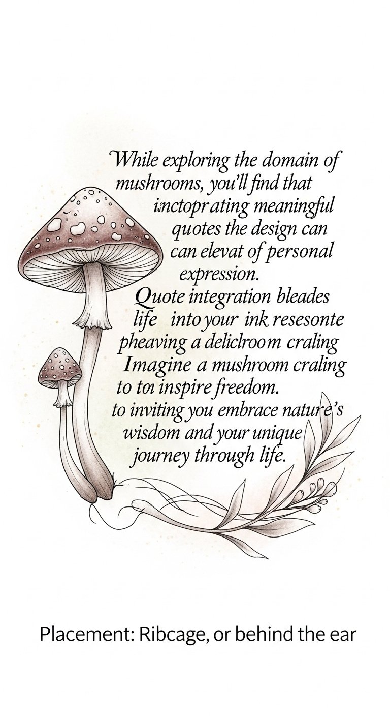 The design pairs the original text as the central quote wrapped by a single elegant mushroom cap and stem, small ferns and dots suggesting spores and wind; symbolism centers on growth, introspection, and the melding of word and nature, evoking calm inspiration and personal journey. Emotionally it reads intimate and contemplative—ideal for someone who wants their mantra literally carried on skin. Recommended placements: inner forearm for visibility and reading, ribcage for privacy and closeness, or behind the ear for a subtle, whisper-like effect; scale adjusted so lettering remains legible and the organic lines flow with body contours.