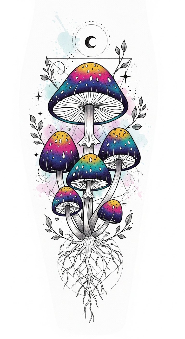 As a tattoo, the composition captures transformation and awakening through bold color transitions and sacred-geometry mycelium, conveying expansion of consciousness and deep connection to nature. The iridescent hues and cosmic accents evoke visions and the mystery of existence while the vines and roots suggest grounding and freedom. Ideal placement is the forearm for visibility and personal reminder, or the upper back for a larger, more contemplative canvas where the design can breathe and flow with body movement.