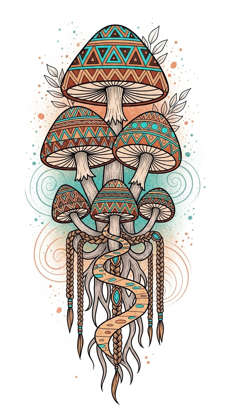 The design visually echoes the vibrant energy and sacred role of psychedelic mushrooms described in the text: mushrooms as vessels of healing and spiritual insight, their roots braided into ceremonial cords symbolizing connection to indigenous wisdom and lineage.