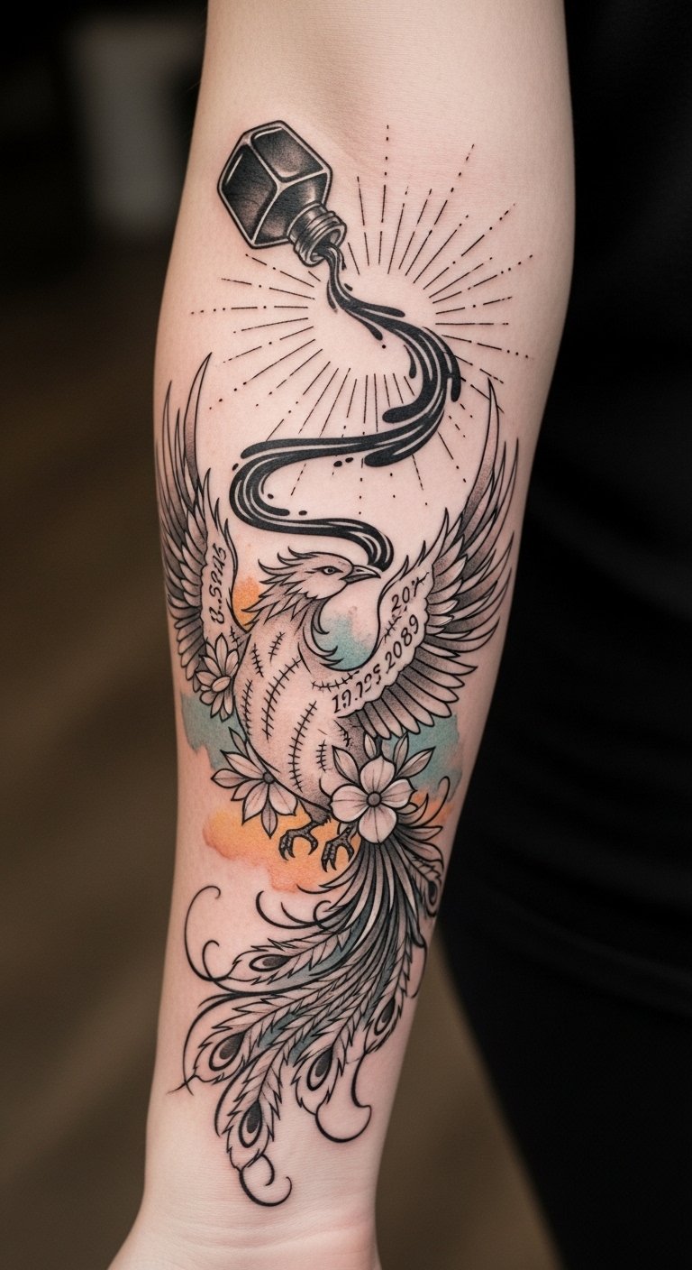 This design symbolizes rebirth and healed wounds: the ink bottle represents storytelling and agency, the phoenix rising from a trail of scar-like stitches and flowers shows transformation and the coexistence of pain and healing, while the hidden dates personalize victories.