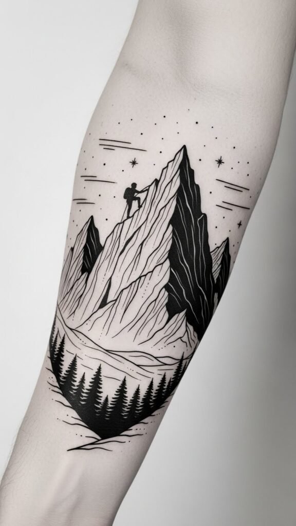This design symbolizes perseverance and the ongoing pursuit of personal summits; the lone climber evokes solitude and courage, the pines ground the piece in rooted resilience, and the stars suggest guidance and wonder.