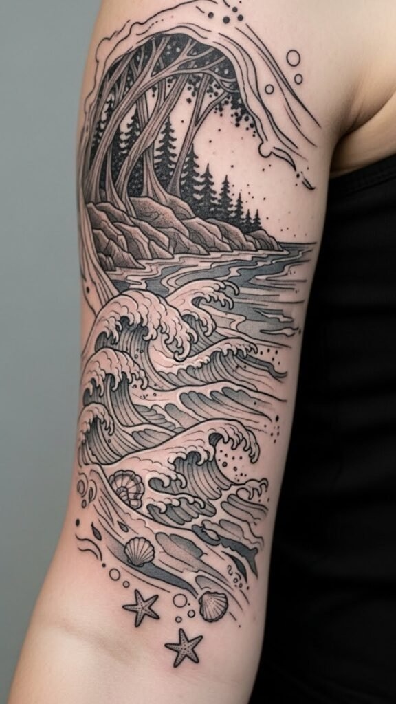Placement suggestions: forearm sleeve wrapping from inner forearm toward wrist for motion, or upper back/shoulder to allow a larger coastal scene and smooth transition from tree line to waves.