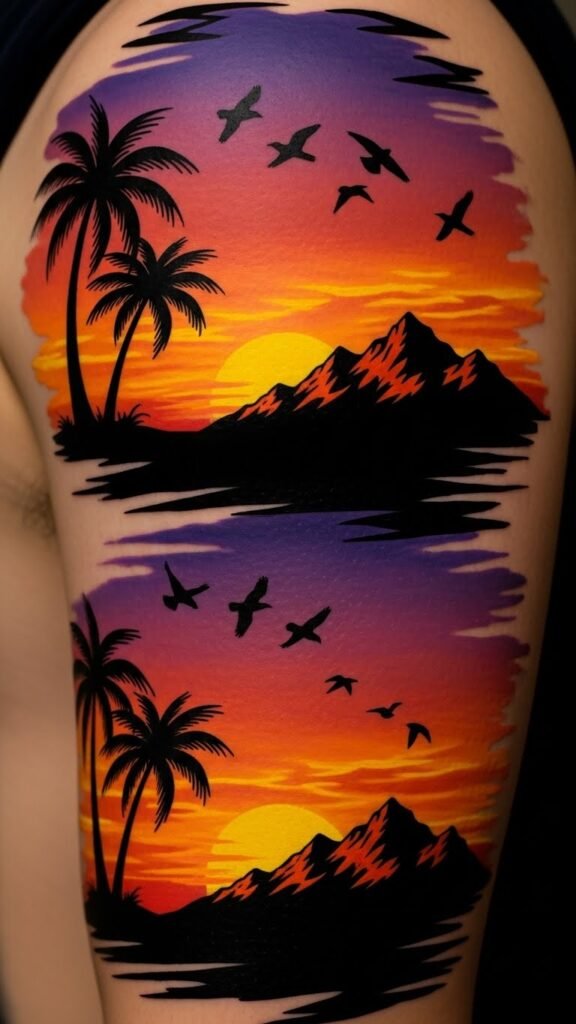 This tattoo concept uses the original scene to symbolize transition and renewal: silhouettes in crisp black juxtaposed with a warm gradient of oranges, pinks, and purples convey the balance between permanence (the silhouette) and change (the sunset). Emotionally it evokes calm, wanderlust, and quiet strength—palm trees and birds suggest relaxation and movement, mountains imply resilience. Ideal placements include the forearm or shoulder blade for elongated horizon compositions, the upper back for larger panoramic pieces, or the ribcage for a more intimate, wraparound sunset scene.