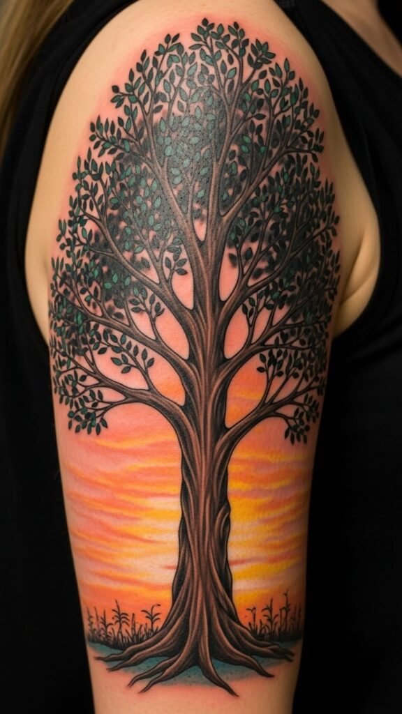 As the tattoo concept, this design places a lone, elegant tree with finely detailed bark and gently branching limbs against a subtle gradient echoing a fading sunset, using delicate linework and soft shading to emphasize strength and grace; symbolically it represents personal growth, resilience through hardship, and the freedom to evolve, evoking calm determination and connection to nature.