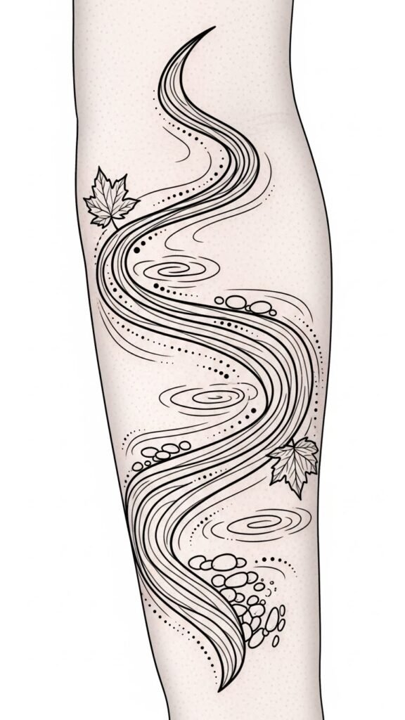 This design evokes calm resilience and continuous motion—symbolizing personal growth, adaptability, and the peaceful acceptance of change. Use along the forearm or ribcage to follow natural body lines so the river appears to move with the wearer; an ankle placement emphasizes quiet, steady progress. Fine-line execution and strategic negative space keep it elegant and timeless, while small natural elements like a leaf or pebble personalize its emotional narrative.