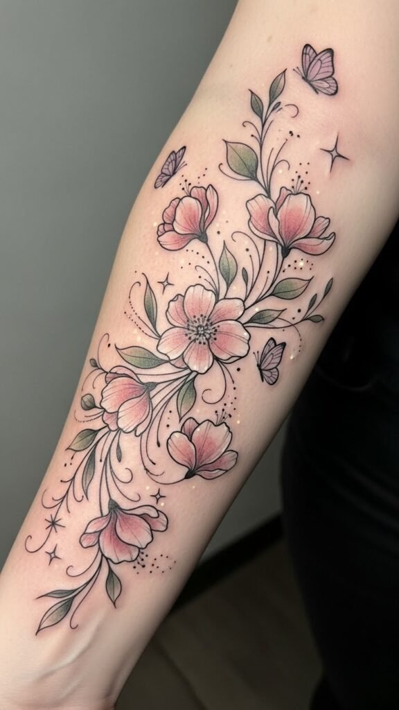 The design’s symbolism blends growth (vines), individuality (distinct bloom shapes), and fleeting magic (stars, butterflies), evoking lightness and optimism; emotionally it feels playful and tender, suitable for personal reminders of joy; ideal placements are forearm wrap for visibility, shoulder cap for graceful curves, or ankle band for a subtle, intimate accent.