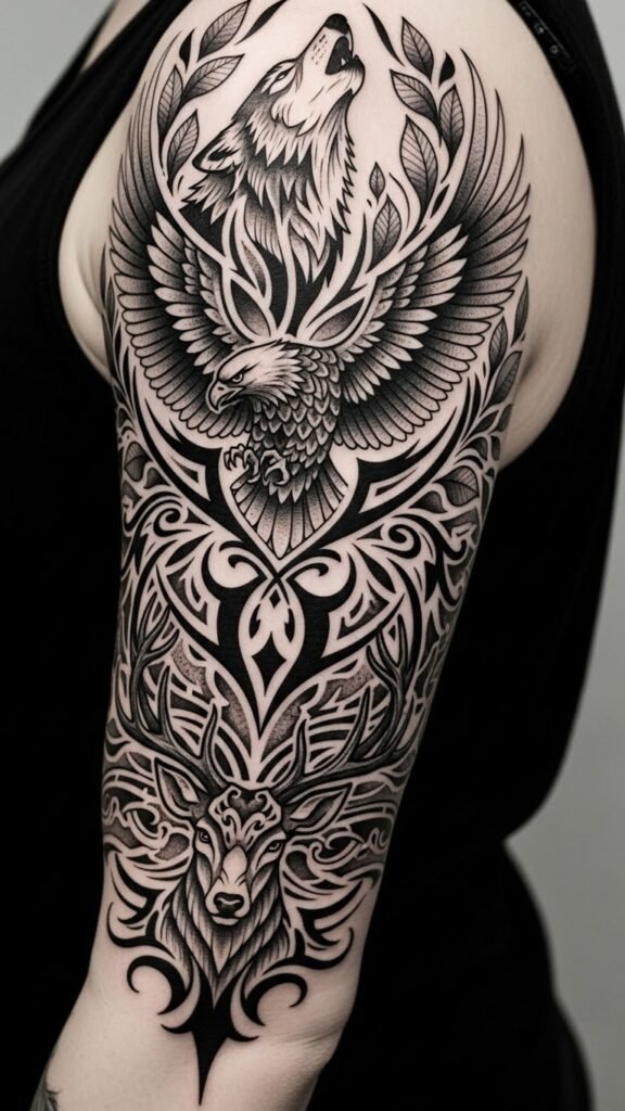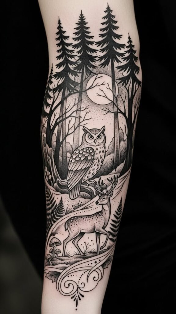 This design uses natural symbolism—the owl for wisdom and guardianship, the deer for gentleness and renewal—and aims to evoke calm, reverence, and a protective emotional tone; ideal placement is a sleeve or forearm wrap to allow movement with the body and visibility, creating a personal reminder of conservation and inner harmony.