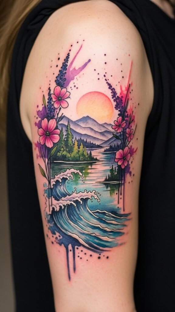 A flowing half-sleeve design that blends loose watercolor washes of teal, indigo, and soft rose with delicate silhouetted wildflowers and a faint shoreline horizon; splatters and gradient bleeds create motion, while fine ink details of stems and a small bird anchor the composition—symbolizing growth, freedom, and calm. Emotionally it evokes serenity and connection to nature, ideal for someone seeking a gentle reminder of resilience and beauty. Placement: outer upper arm wrapping toward the shoulder, allowing the washes to read as a continuous, wearable landscape.
