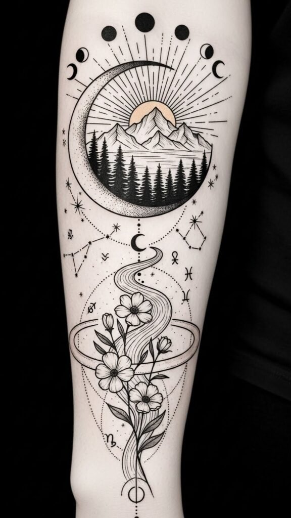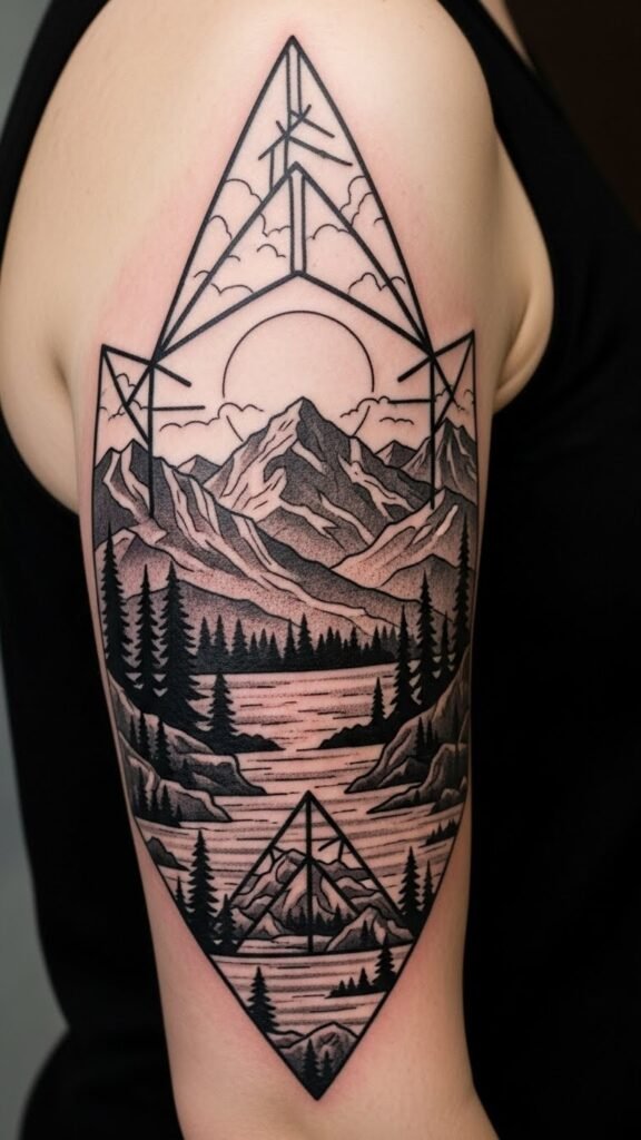 A design concept: a forearm or upper back tattoo combining a triangular frame filled with a layered minimalist mountain range, a crescent moon, and a line-work river flowing into geometric hexagon patterns that dissolve into dotwork trees; bold clean lines mixed with delicate stippling give contrast. Symbolically this piece merges human order and natural spontaneity—the triangle as stability, mountains as challenge and resilience, river as life’s flow, and hexagons as interconnected systems—evoking freedom, balance, and continuity. Ideal placement is along the forearm for visibility and movement or the upper back for a larger, contemplative canvas; shading and line weight can be adjusted to personal intensity and pain tolerance.