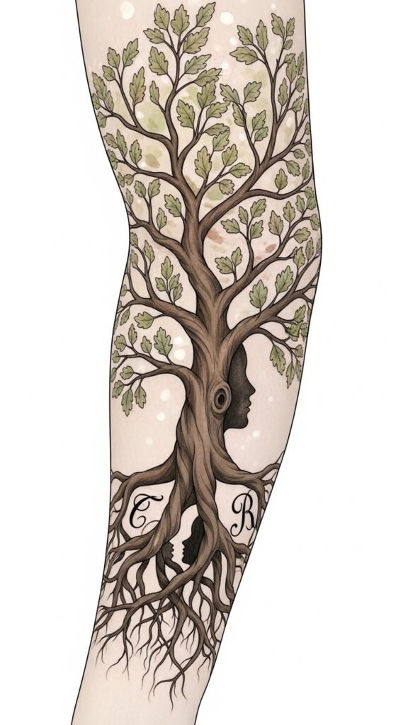 A design that merges roots and faces honors continuity and belonging: the oak’s stability represents enduring family bonds, branches hold names or symbols for each member, and hidden faces in the roots signify ancestors who shaped you. The watercolor tones add warmth and nostalgia while fine lines keep it elegant and personal. Emotionally it evokes pride, remembrance, and protection; ideal placement is forearm for daily visibility or ribcage for intimacy, allowing expansion with new branches over time.