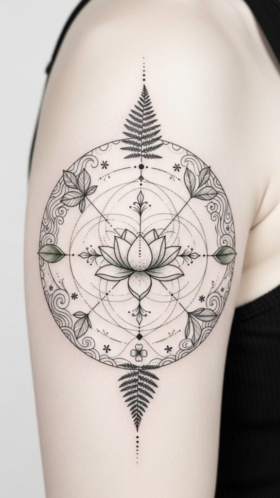 This tattoo concept symbolizes interconnectedness—lotus for spiritual awakening, leaves and ferns for growth and resilience, waves for emotional flow—designed to evoke calm and mindful presence; ideal on the forearm for daily visibility or on the back shoulder as a personal, contemplative piece.