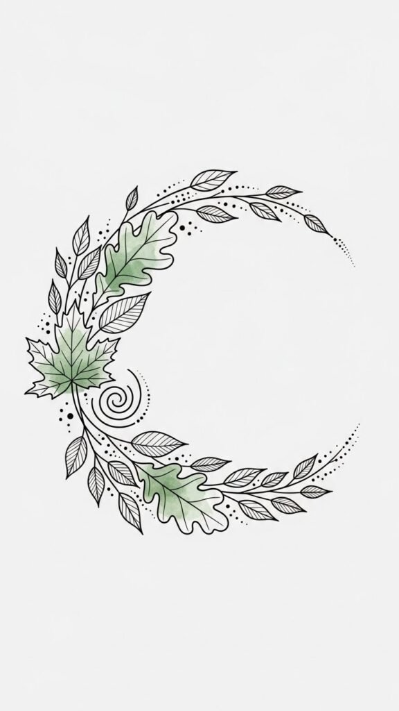 This design emphasizes cyclical growth and personal transformation—maple for change, oak for strength, birch for renewal—evoking calm, resilience, and continuity; ideal along the forearm, shoulder blade, or ribcage where the crescent flow complements natural body lines and allows the watercolor to fade gently with movement.