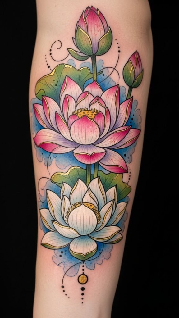 Fine linework and watercolor create a gentle, meditative feel that complements curved body areas like the inner forearm, sternum, or between the shoulder blades, while gold accents catch light and draw the eye, reinforcing the sacred, transformative quality of the lotus.