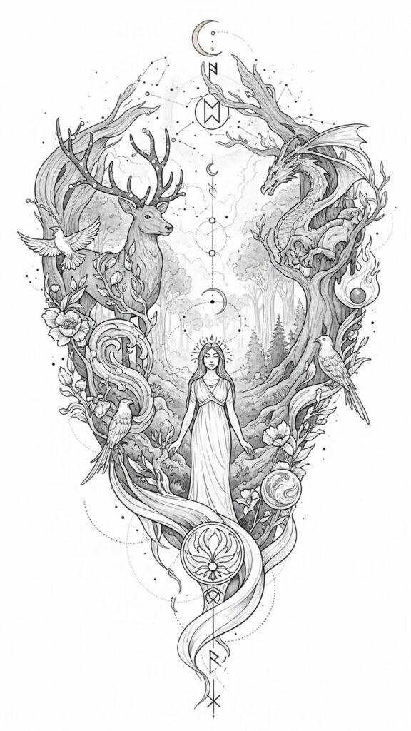 Picture mythical creatures roaming dreamlike landscapes, intertwined with nature symbolism and elemental forces. Infuse goddess representations and spirit animals into your design, drawing inspiration from ancient legends and celestial myths.