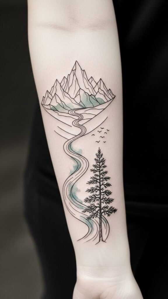 The river represents continual movement and change, mountains mark resilience and achievement, the pine signifies endurance, and the birds suggest liberation; placed along the forearm the composition follows the natural line of the arm to feel intimate and visible, evoking calm pride and invitation when seen.