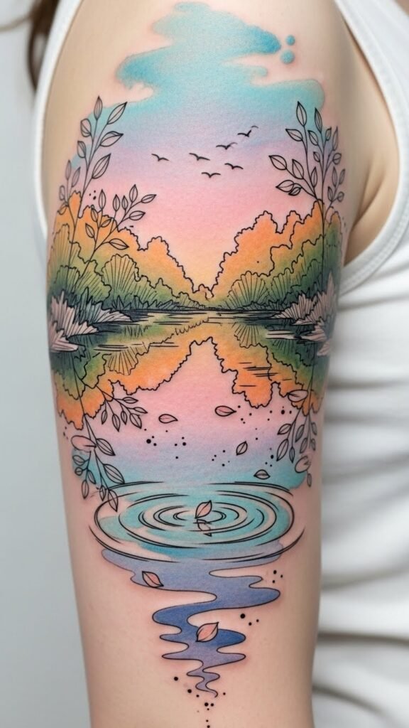 A tattoo inspired by these moments can symbolize your journey toward inner peace and freedom. This design uses the reflected landscape and ripples to symbolize introspection and emotional balance; watercolor tones convey calmness while fine line details add clarity and grounding.
