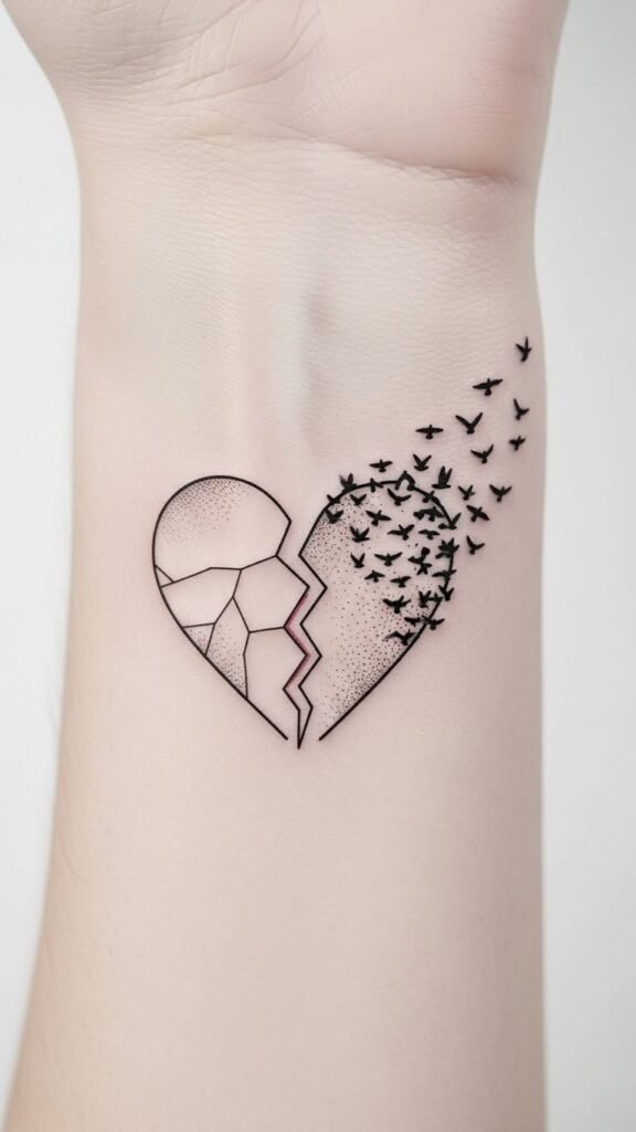 The imagery—half-heart breaking into birds—symbolizes transformation from hurt to liberation, evoking bittersweet strength; ideal placements are the inner wrist, collarbone, or behind the ear where its intimate size and fine lines read as a personal talisman rather than loud statement.