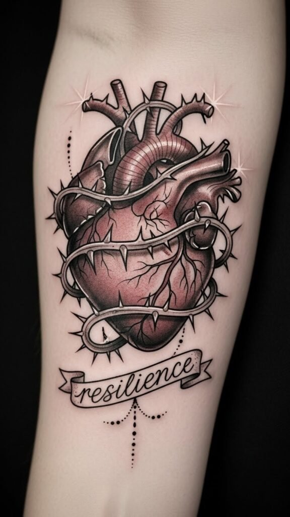 Thorny heart imagery powerfully intertwines beauty and pain, making it a striking choice for those embracing the complexities of love and heartbreak. This design embodies thorny heart symbolism, reflecting emotional protection imagery.