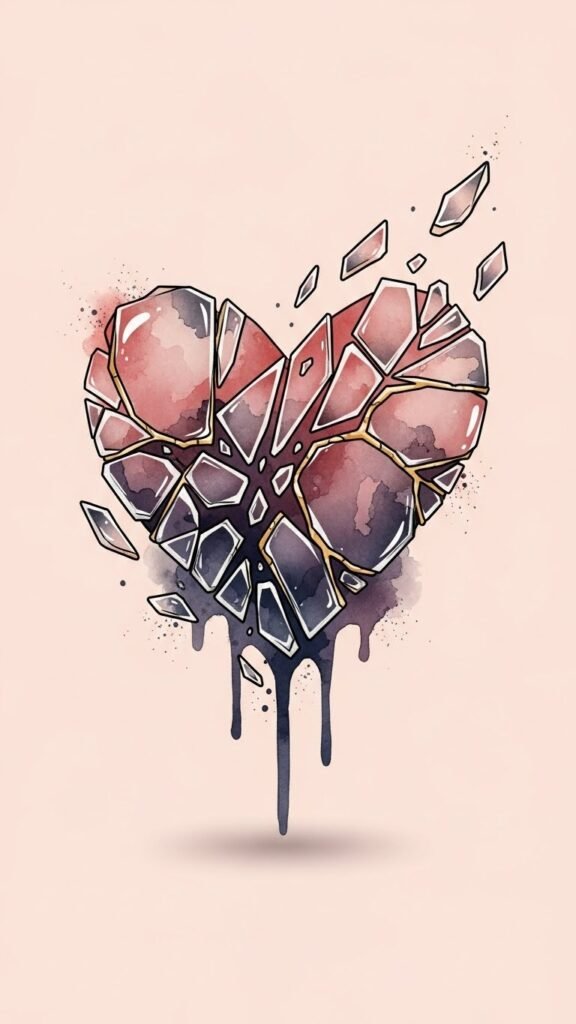 While love can often feel like a beautifully intricate tapestry, a shattered heart with shards lays bare the rawness of heartbreak and emotional upheaval. This design symbolizes shattered relationships, capturing the essence of pain while highlighting your journey toward emotional healing. Each shard represents resilience, a confirmation of your strength as you rise from the fragments and reclaim your narrative. Place over the left chest near the heart for personal meaning, along the inner forearm for visibility during recovery, or on the ribcage for a more private, intimate testament; the watercolor bleed and kintsugi lines emphasize vulnerability and repair.